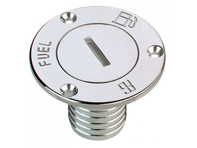 “FUEL” labelled deck filler with hose connector, in chromium-plated brass.