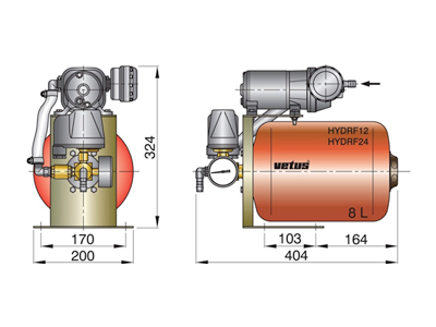 Type HYDRF works the same as the basic pressurised water system type HF, but has an adjustable pressure switch, a manometer (pressure gauge) and an additional non-return valve. Meets the EMC requirements.